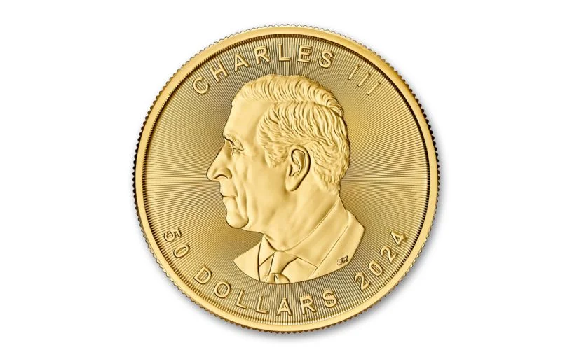 - FIRST GOLD MAPLE LEAF COIN WITH CANADIAN EFFIGY OF KING CHARLES III – Celebrating its 46th year of release, the 2024 Gold Maple Leaf’s primary design is still as lifelike as ever. One leaf, exhibiting superior texture and detail, is surrounded by a vivid burst of radial lines. New this year is the effigy of His Majesty King Charles III, replacing the portrait of his late mother, Queen Elizabeth II, who passed away in 2022.