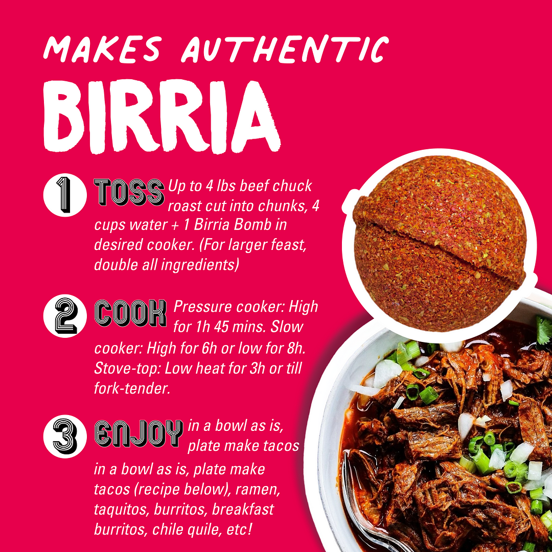- Versatile Delight: Whether you're cooking up tacos, filling up burritos, or topping off nachos, our Birria Bomb Pack is your secret ingredient for a mouthwatering masterpiece. ๐ฎ๐ฏ