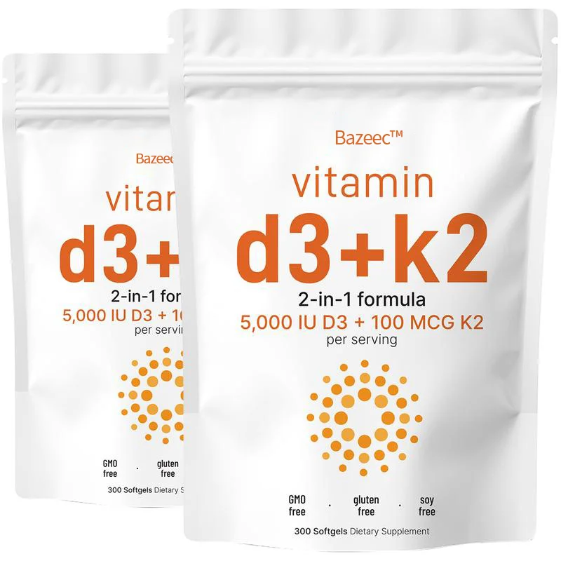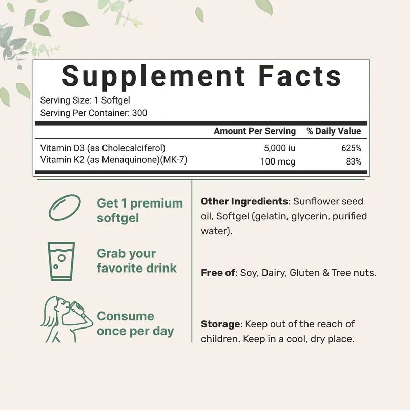 Each pouch offers 300 easy to consume mini coconut oil infused softgels. A potent one a day complex that provides natural sunshine vitamin synergy. 5000 iu Vitamin D3 and 100 mcg vitamin K2 per dose.
