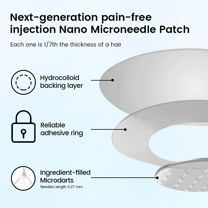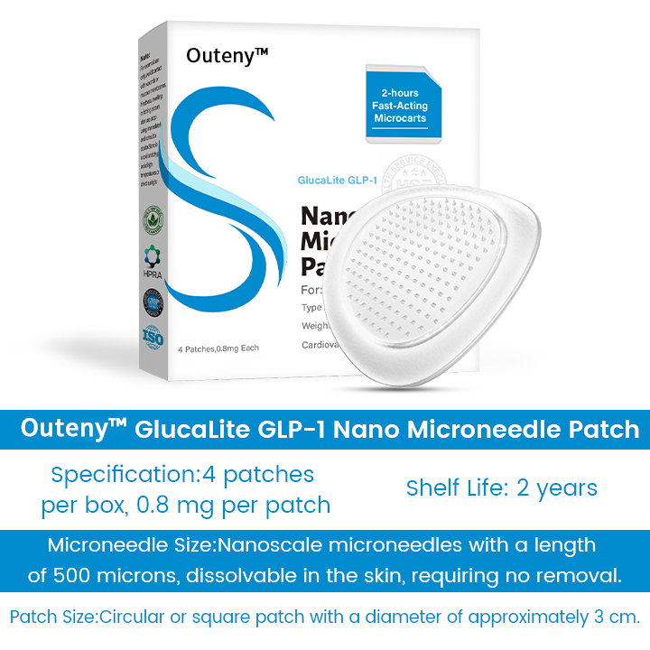 No injections needed, easy blood sugar control and weight loss! Outeny™ GlucaLite GLP-1 Nano Microneedle Patch contains GLP-1 (an upgraded GLP-1 analogue) that mimics the GLP-1 mechanism: promoting insulin secretion, inhibiting glucagon, and delaying gastric emptying, lowering blood sugar, reducing appetite, and aiding weight loss. Compared to traditional GLP-1 that requires frequent injections, the patch is more convenient, no needles, saving time and money.
