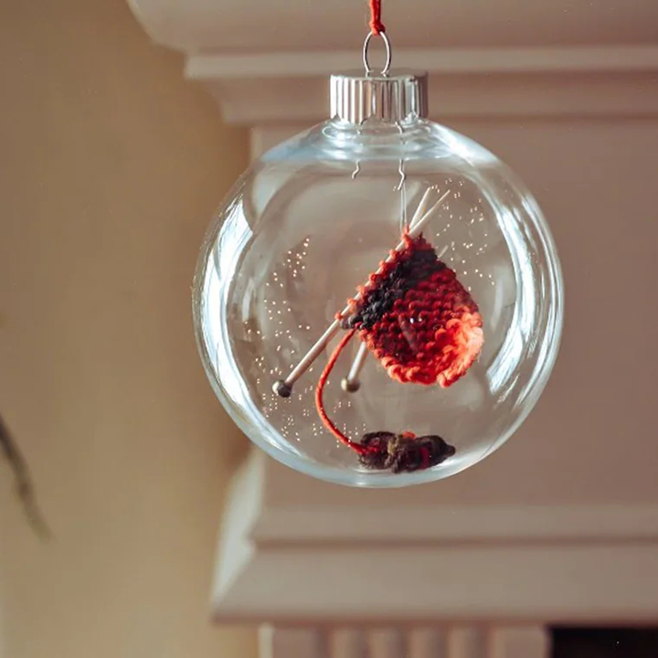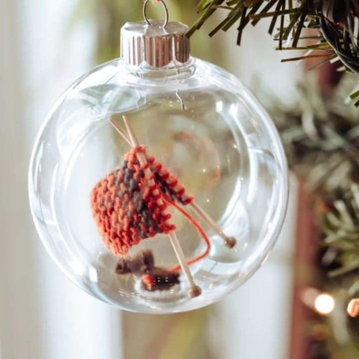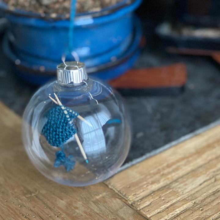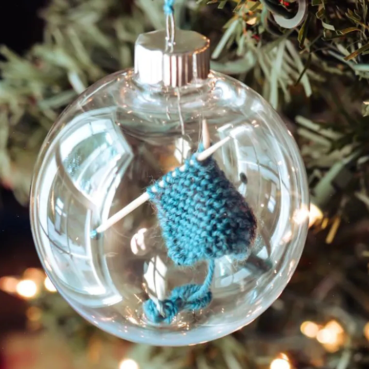 Need a unique gift for the knitter in your life? These handmade ornaments feature a "WIP" (work in progress) still on the needles and displayed inside of an acrylic ornament. A little hank of yarn dangles below.