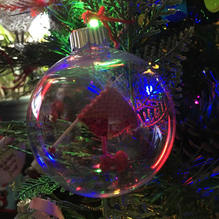 Take care not to take the top off the ball or the knitting may come loose. Matching yarn is attached and used to hang the ornament on your tree.