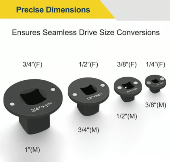 With precise dimensions: 3/4" (F) to 1" (M), 1/2" (F) to 3/4" (M), 1/2" (F) to 3/8" (M), and 1/4" (F) to 3/8" (M)—this set ensures a secure and accurate fit for various tools while maintaining a low-profile design for easy access in tight spaces.