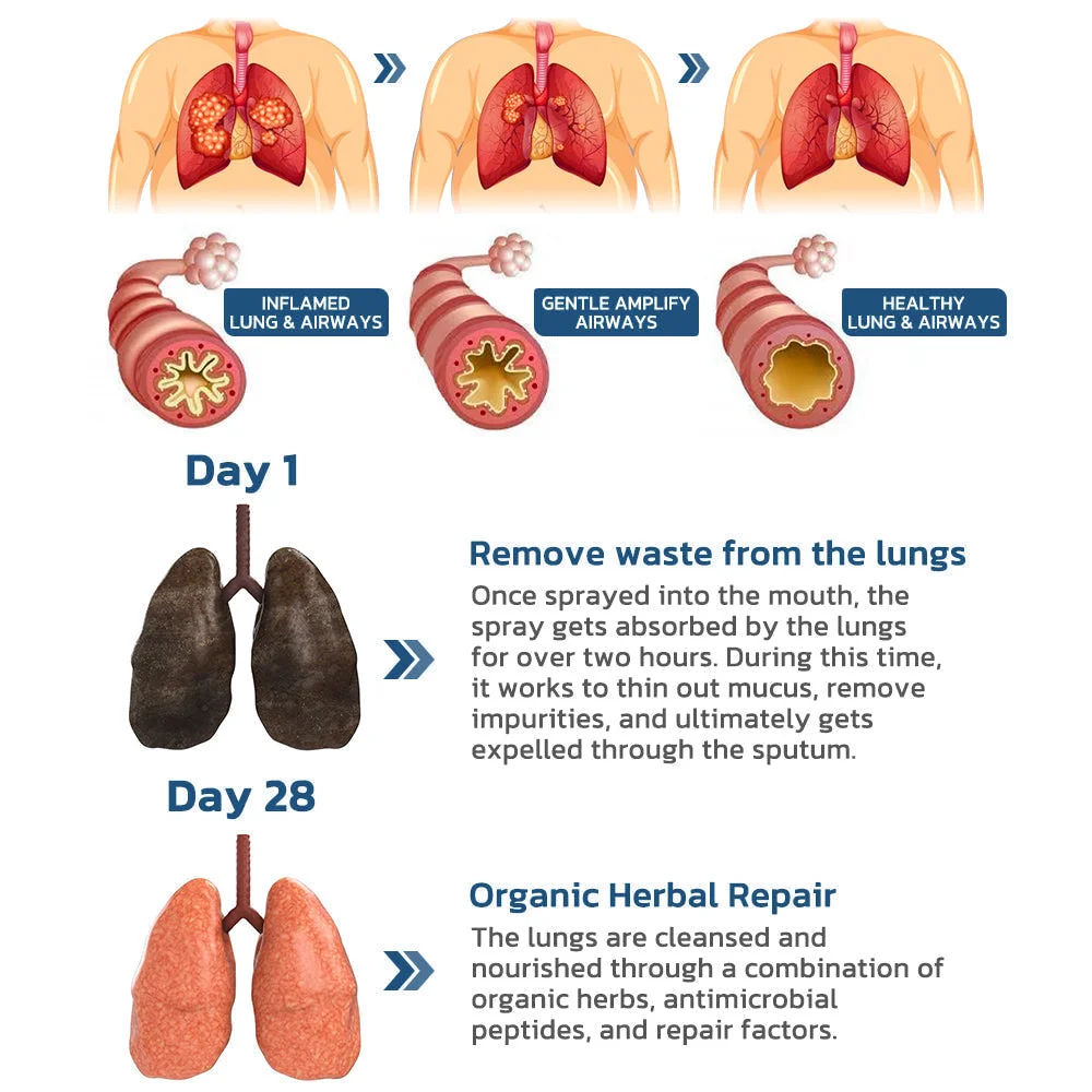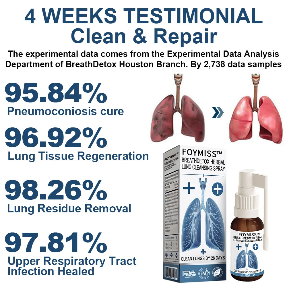 Unlike medications, on which your body may become reliant on them for relief, the Foymiss™ BreathDetox Lung Cleansing Spray is 100% natural and over time it gradually helps you strengthen your lungs. Designed to cleanse the lungs and respiratory tract, effectively relieve the symptoms of respiratory diseases, regenerate cells and normalize breathing.