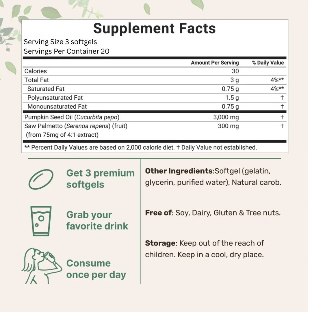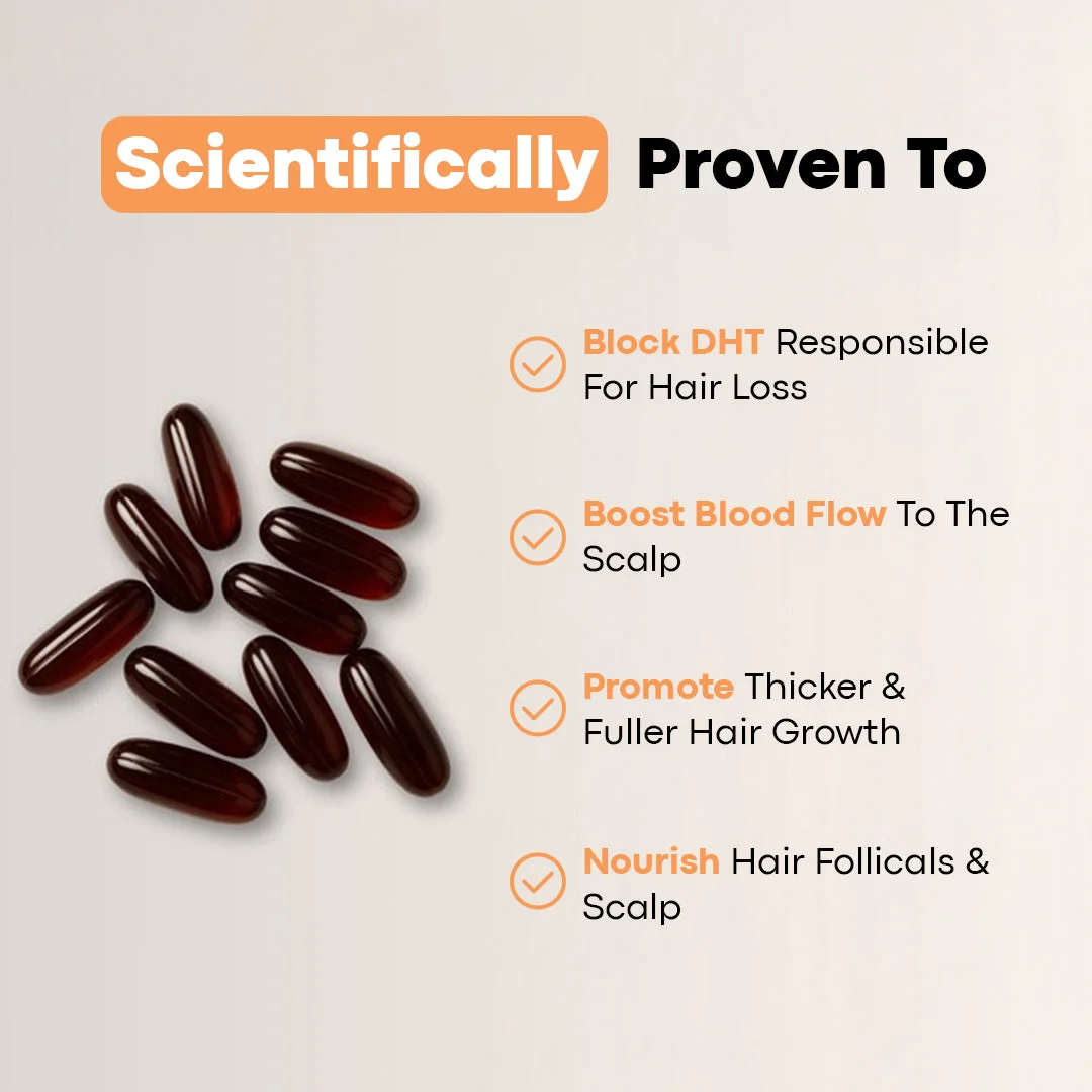 Our easy-to-swallow softgels, packed with pumpkin seed oil & saw palmetto, deliver a powerful blend of natural ingredients designed to stop shedding, nourish your scalp, and support healthy hair regrowth. Get stronger, fuller hair starting from within!