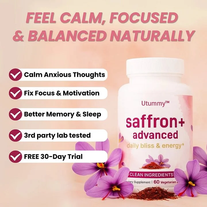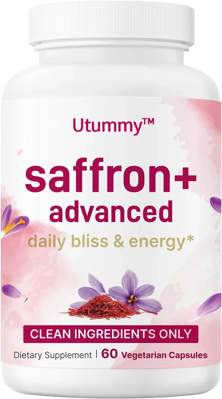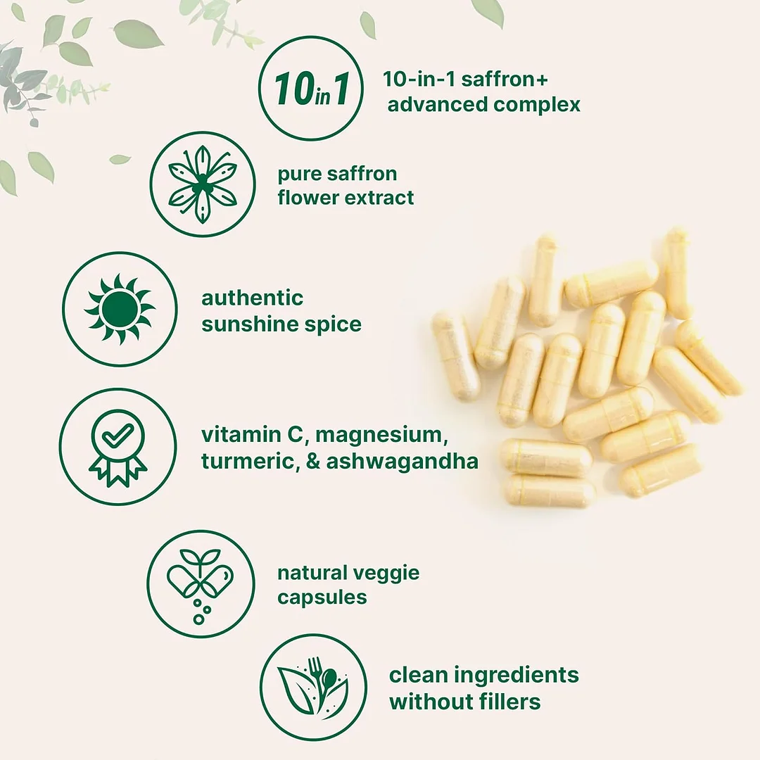 Each bottle includes 60 veggie capsules for a 30-day supply, delivering saffron along with fat-soluble vitamin C, magnesium glycinate, St. John’s Wort, passionflower, L-theanine, 95% turmeric extract, KSM-66 ashwagandha, rhodiola rosea, and black pepper for maximum absorption.